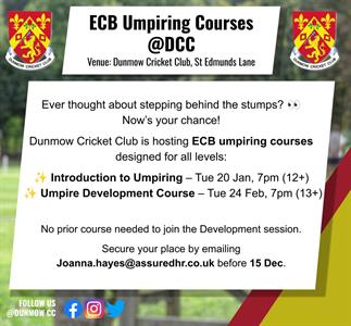In anticipation of next season we have arranged two certified cricket umpiring courses to be held at Dunmow cricket club from 7.00pm on the followi... [ Read more ]